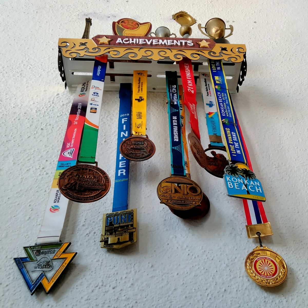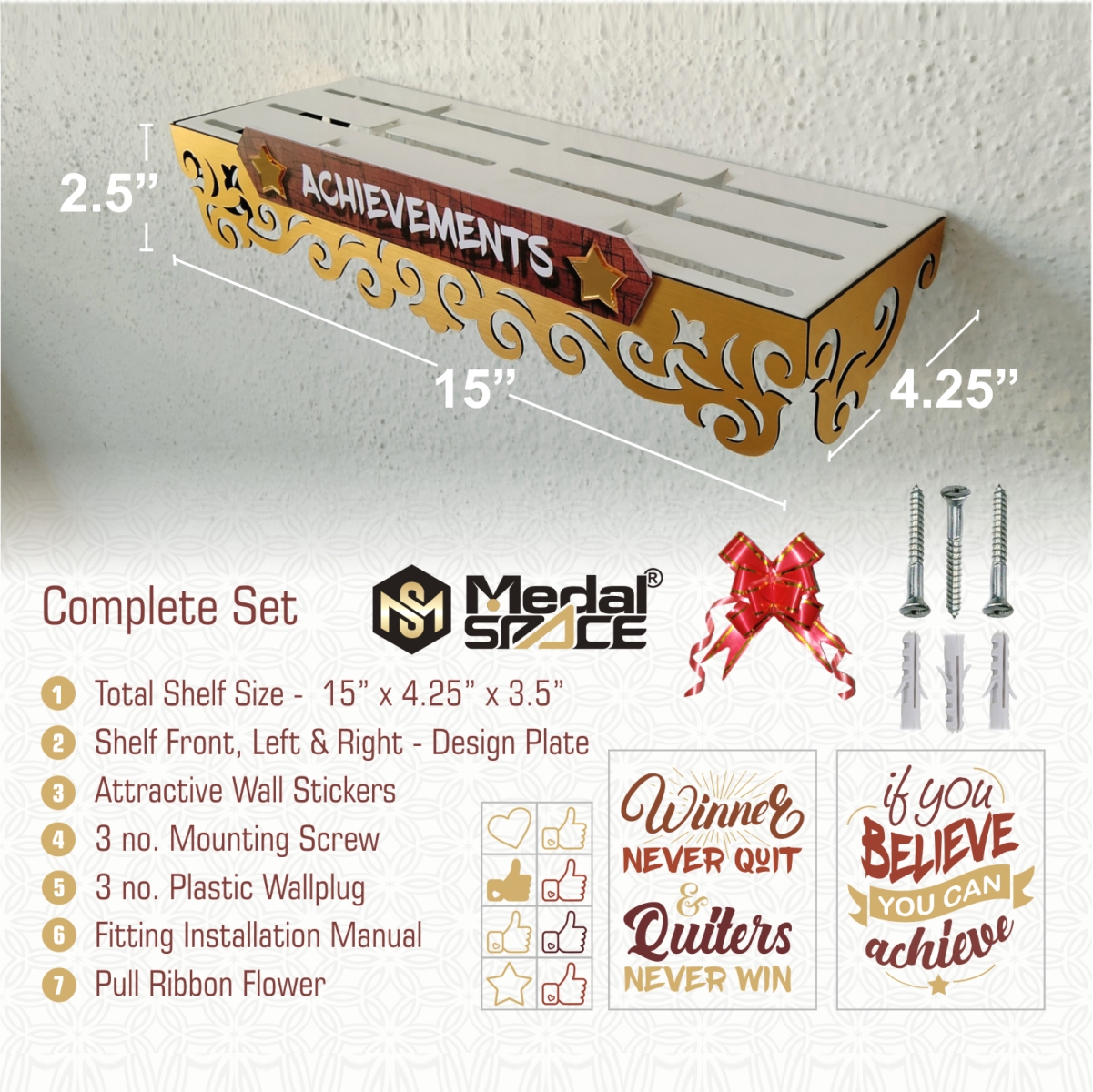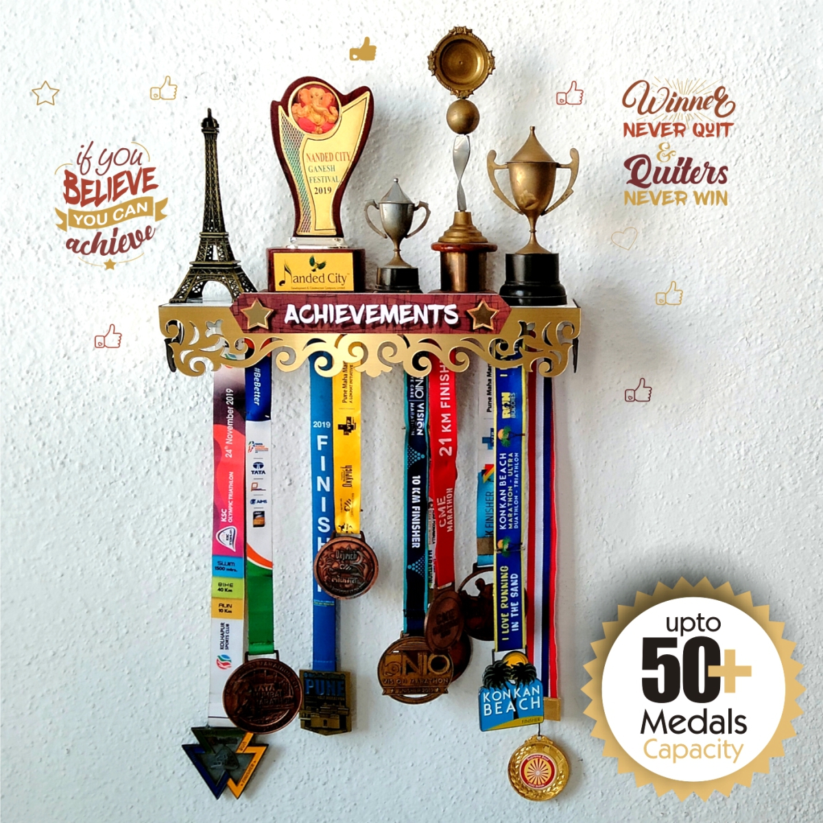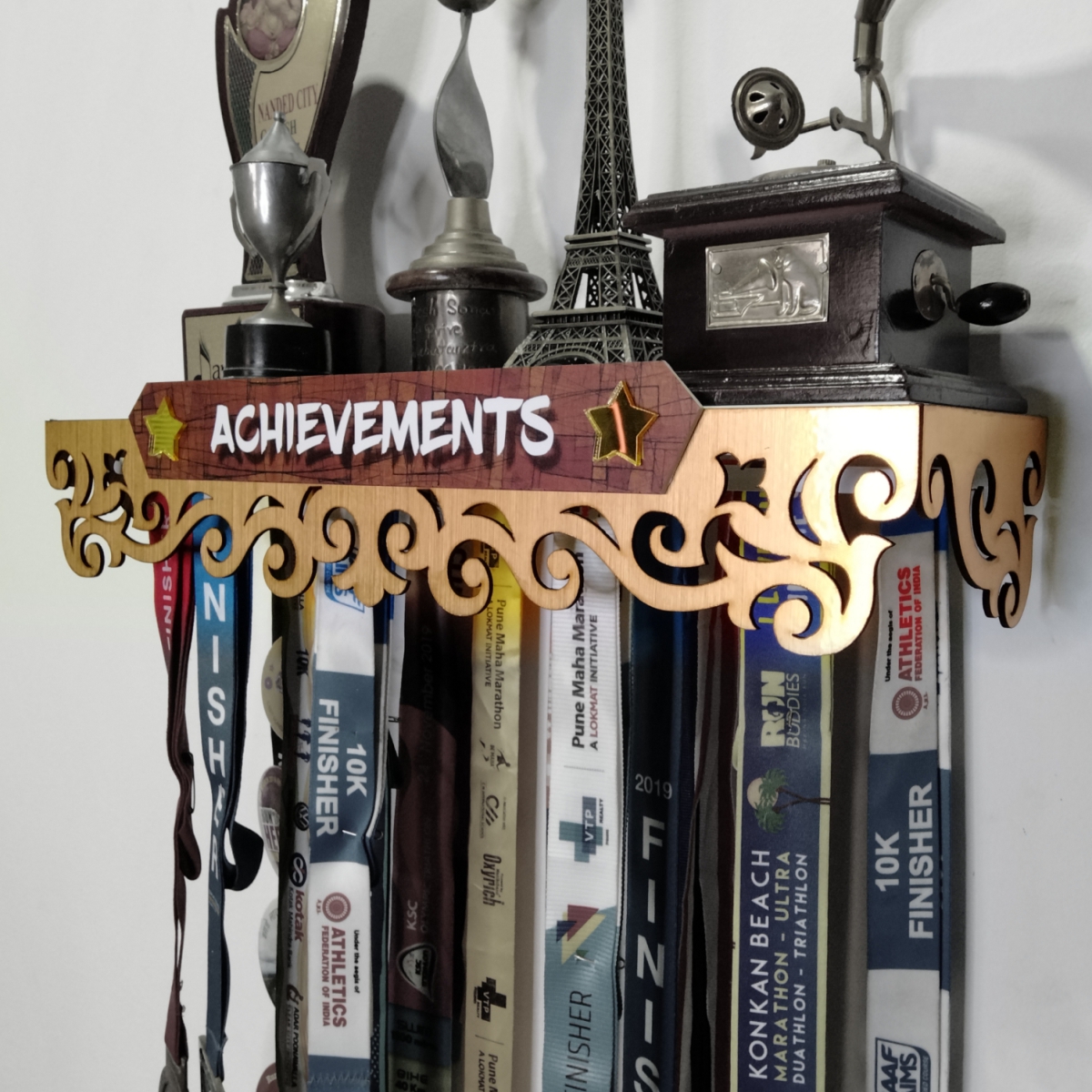 Medal Space a proud brand under the Space store presents a Achievement Shelf – Medals & Trophy Hanger Shelf, which is dedicated to honoring the journey of  athletes .  A display where you can adorn your achievements  awards. You can motivate yourself and others with the mildstone earned through your discipline and hard work. achievements deserve to be seen and celebrated by every dedicated fitness enthusiast.