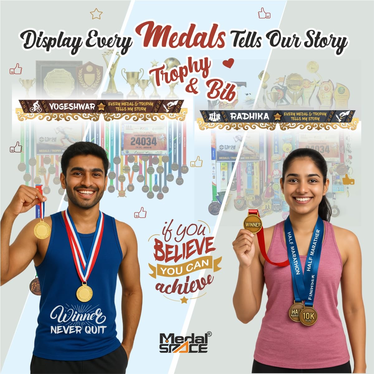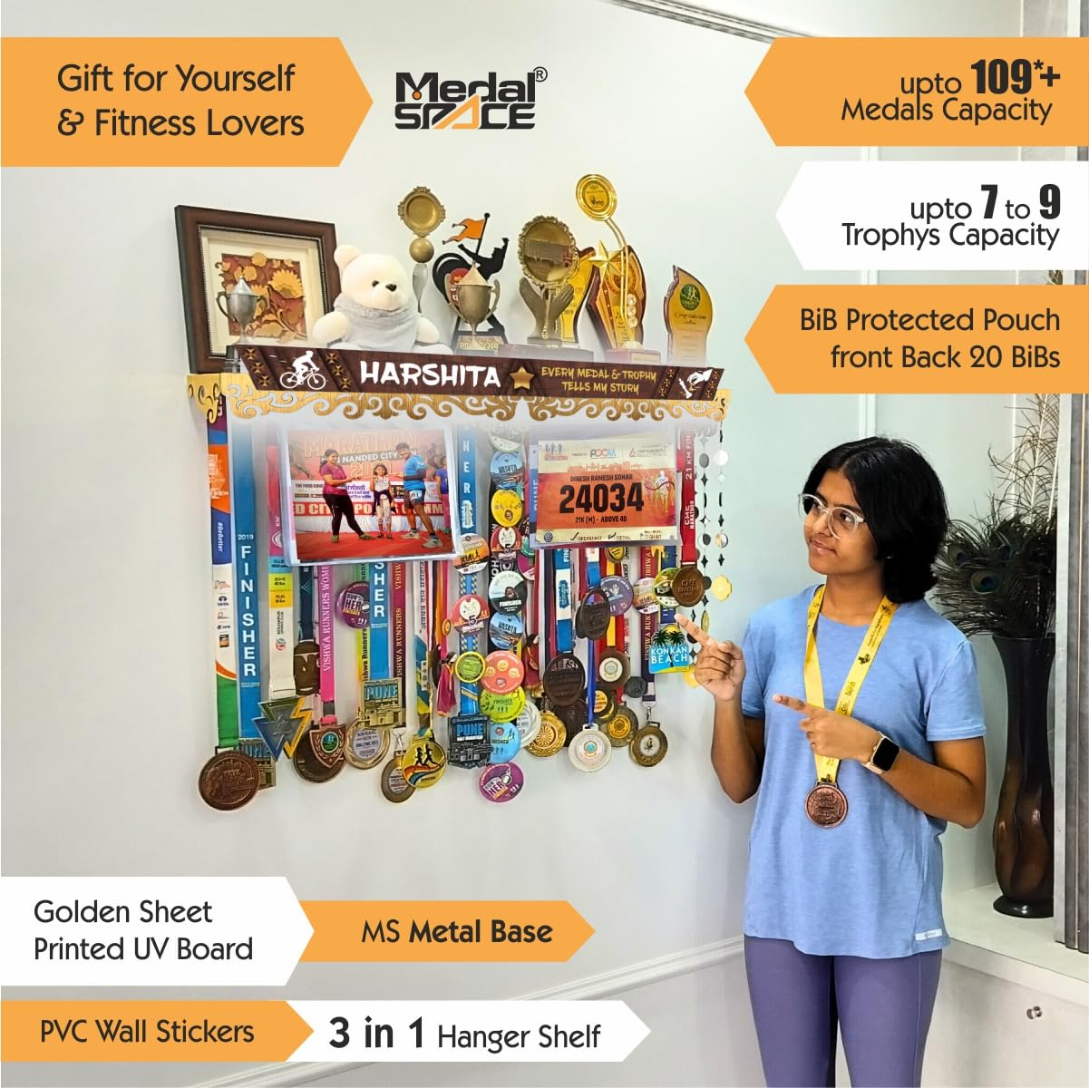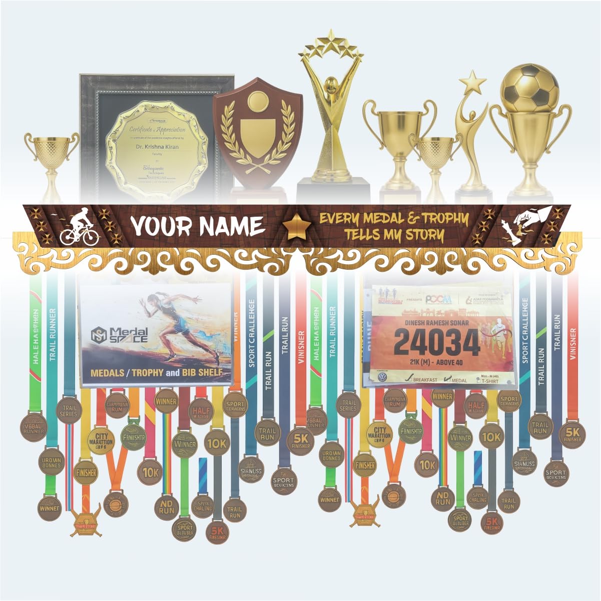 • PERSONALISED DISPLAY: Large premium 3-in-1 medal hanger with customizable name, icons and motivational base line, making it a unique gift for fitness enthusiasts and achievers