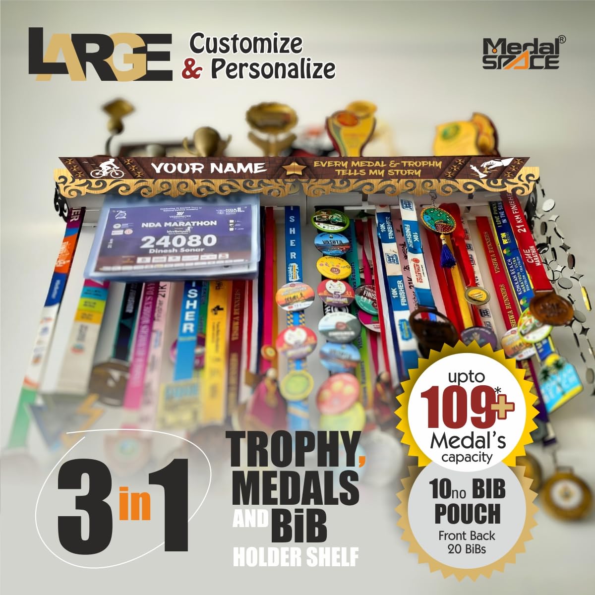 Medal SPACE  LARGE Premium Personalized Medals Display Hanger – 3 in 1 Achievements Display , Holds 99+ Medals,  8-9 Trophies, Photos & Bib Pouches Premium Unique Display for your Achievements.